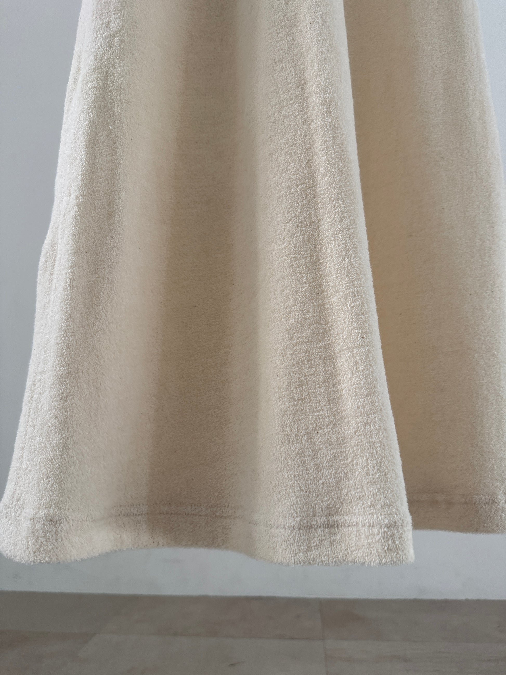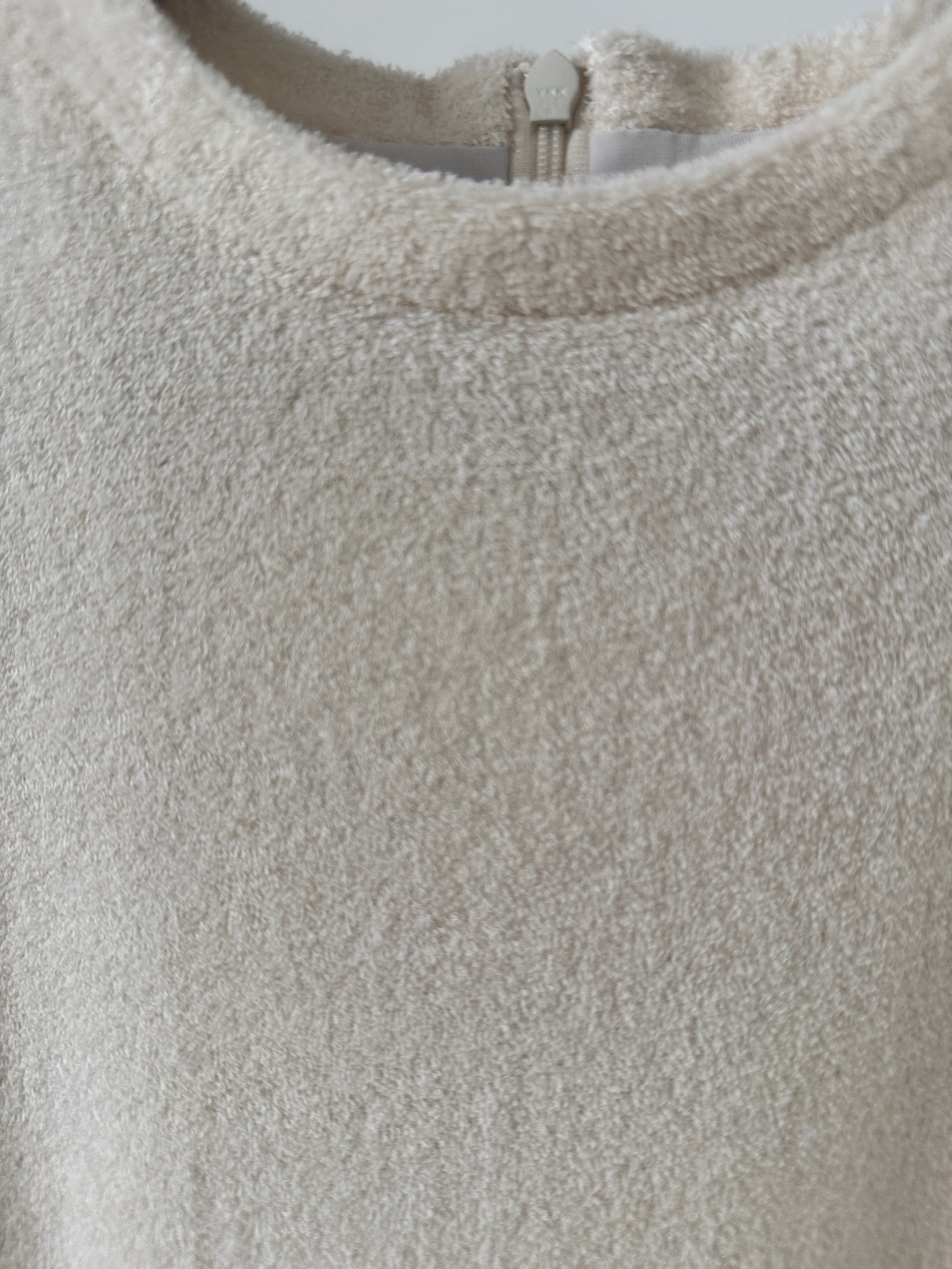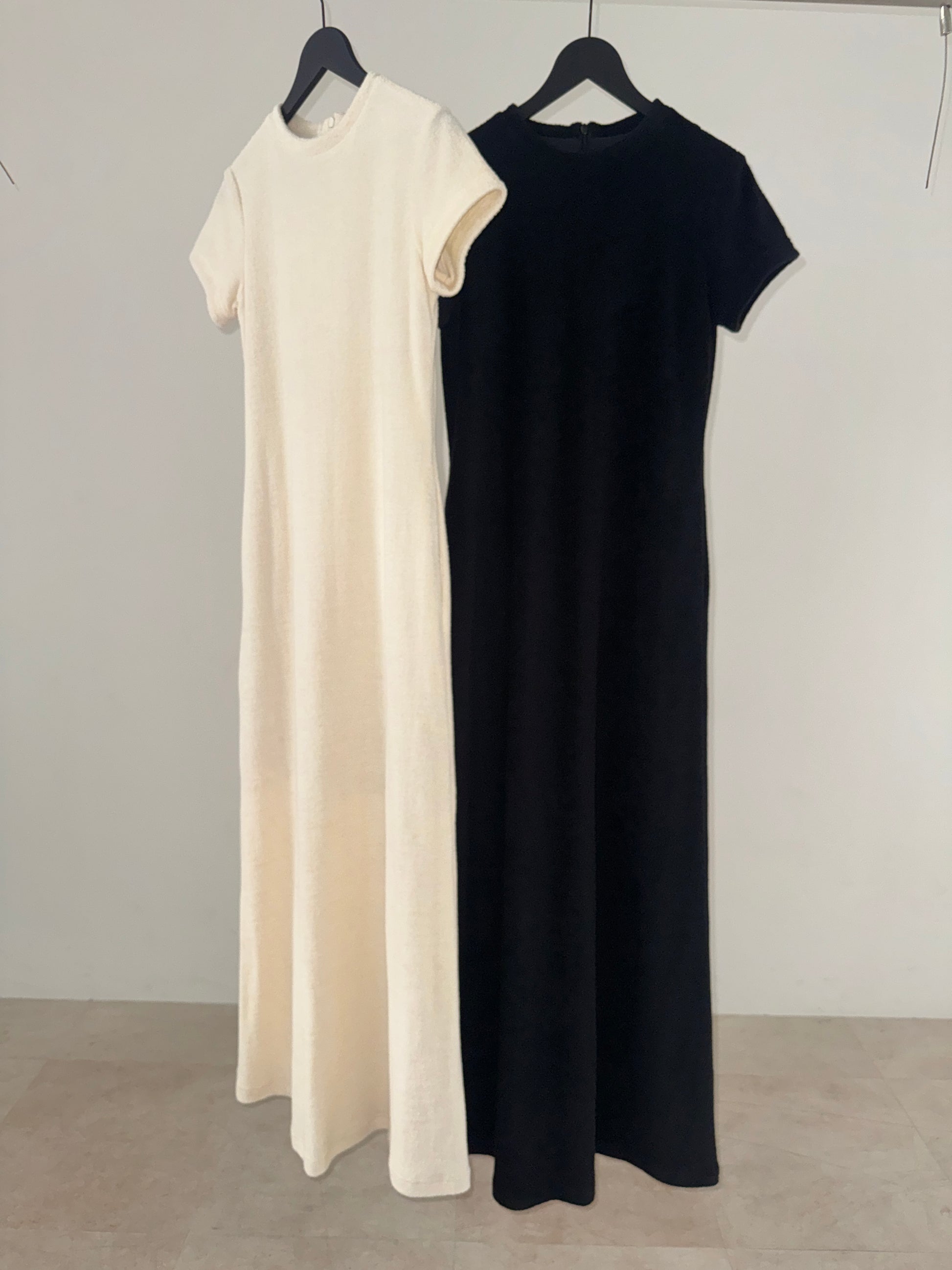 パイル生地。クルーネック。短いハーフスリーブ。Aラインワンピース。ロング丈。裏地付き。通年使用◯。上半身は細身ですが、腰から裾に向かって、広がるライン。控えめな波打ちがでるくらいの生地の量により、大げさになりすぎないシンプルなドレスラインの仕上がり。見た目がカジュアルな生地とドレスのフェミニンな雰囲気の融合が新鮮。贅沢な生地をロング丈、フレア分の生地の分量を使用している、とっても贅沢なワンピースです