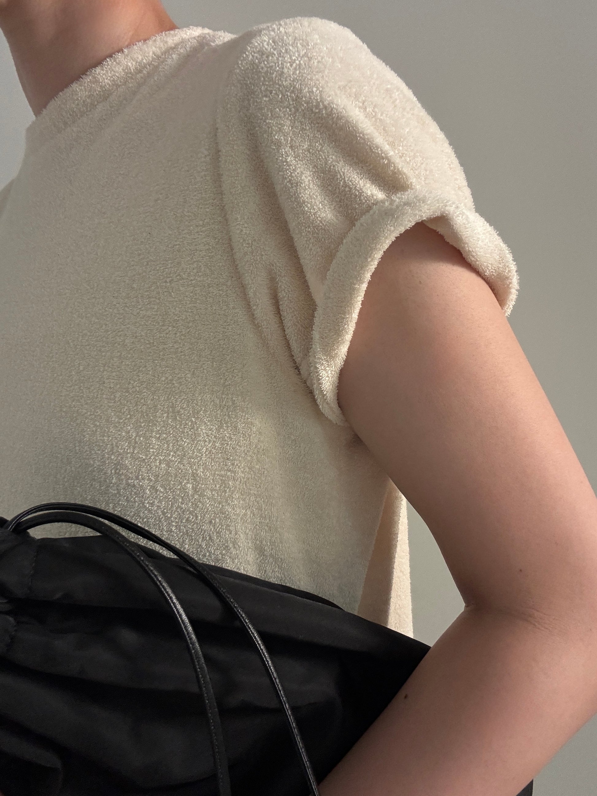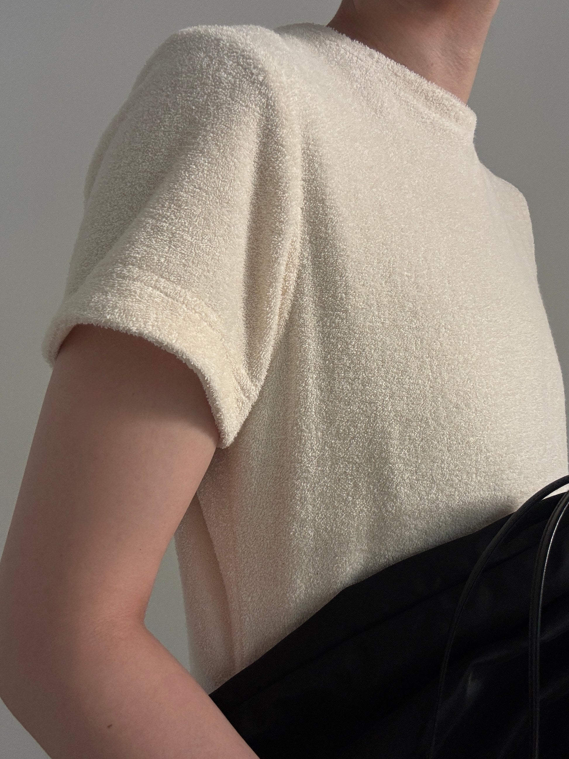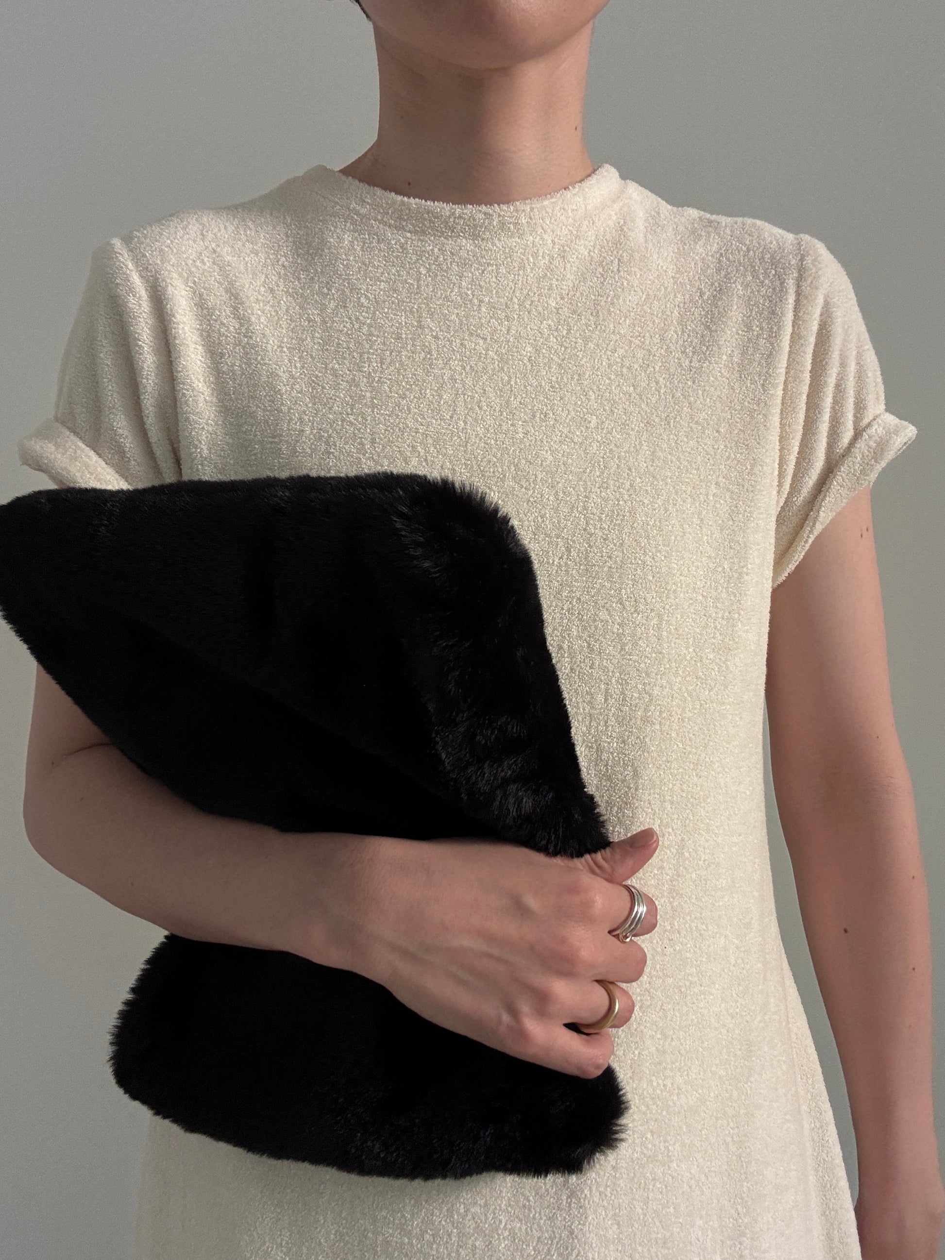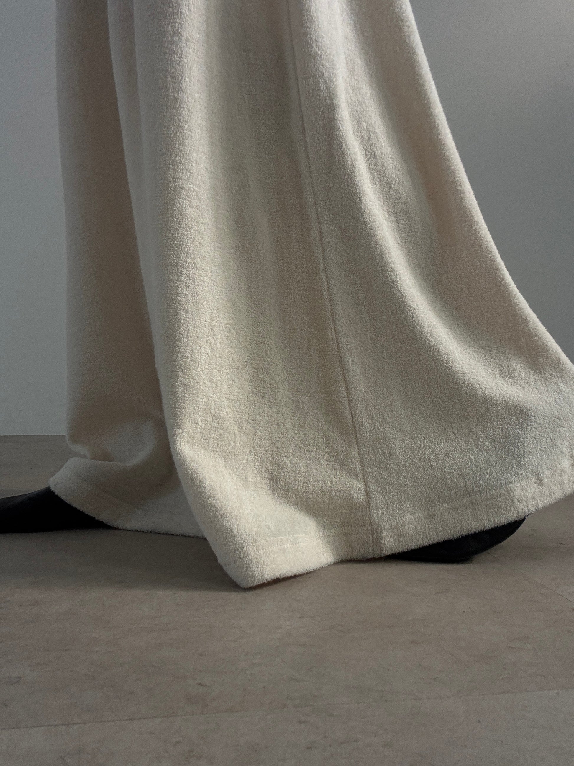 パイル生地。クルーネック。短いハーフスリーブ。Aラインワンピース。ロング丈。裏地付き。通年使用◯。上半身は細身ですが、腰から裾に向かって、広がるライン。控えめな波打ちがでるくらいの生地の量により、大げさになりすぎないシンプルなドレスラインの仕上がり。見た目がカジュアルな生地とドレスのフェミニンな雰囲気の融合が新鮮。贅沢な生地をロング丈、フレア分の生地の分量を使用している、とっても贅沢なワンピースです